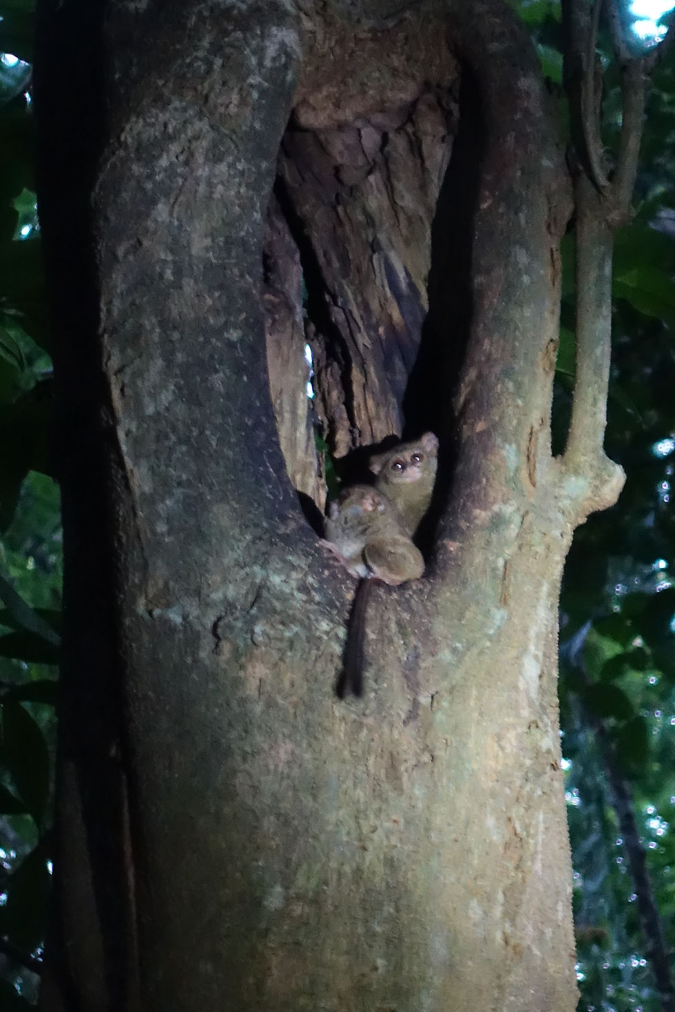 Gegen 10:30 Uhr gönnten wir uns eine Pause in unserer Unterkunft, um uns für die Abendtour zu stärken, welche gegen 16:30 Uhr losging. Der Weg durch den Nationalpark war in etwa derselbe, wie am Morgen, nur begegnete man jetzt anderen Tieren, wobei das größte Interesse dem Tarsius bzw. Sulawesi-Koboldmaki galt, ein kleines, nachtaktives Tier, welches zur Gattung der Primaten gehört. Es war zwar etwas schwierig dieses winzige Tier im dichten und dunklen Wald auszumachen, wir waren aber erfolgreich und so kann ich meiner Freundin Eileen, die ganz vernarrt in diese Tierchen ist auch ein Bild davon präsentieren 😊