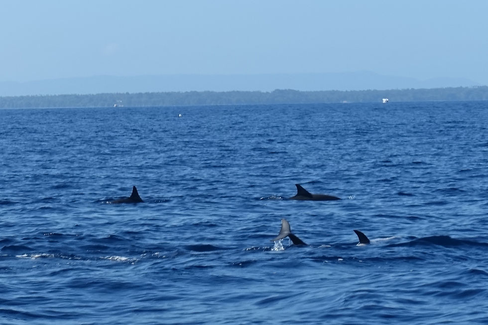 und so fuhren wir mit ihm, seinem Freund und uns beiden ca. 1 Stunde aufs Meer um uns kurzerhand inmitten von knapp 100 Delphinen wiederzufinden, die mit unserem Boot um die Wette schwammen.