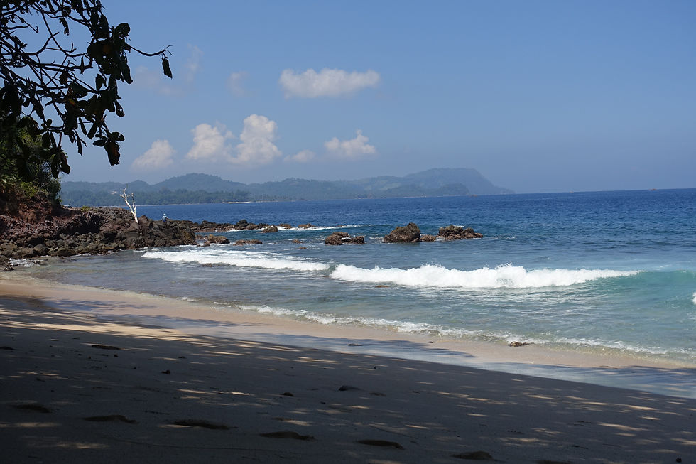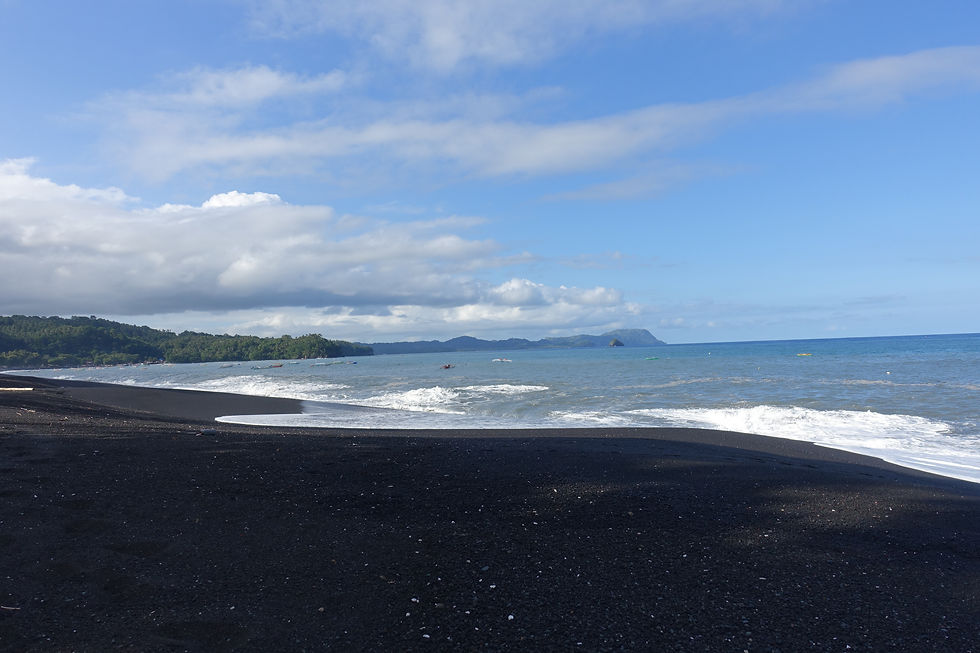 Am nächsten Morgen wurden wir gegen 07:30 Uhr vom Schiffsführer persönlich mit dem Jeep von unserer Unterkunft abgeholt und befanden uns kurze Zeit später bereits wieder auf dem Rückweg nach Manado. Vom Hafen aus haben wir uns dann über Grab eine Fahrerin organisiert, die uns nach einem kurzen Zwischenstopp bei typisch minahasischem Essen ins ca. 2 Stunden entfernte Bitung bzw. Tangkoko brachte. Unsere Unterkunft liegt mitten im Dschungel und nur 5 Gehminuten vom Nationalpark entfernt, der insbesondere für die kleinen Tarsiere und unter Ornithologen als Paradies bekannt ist. Ich hoffe in der gebuchten Morgen- und Abendtour werden wir welche entdecken. Aber inzwischen haben wir uns den schwarzen und leider sehr dreckigen Strand ganz in der Nähe angesehen